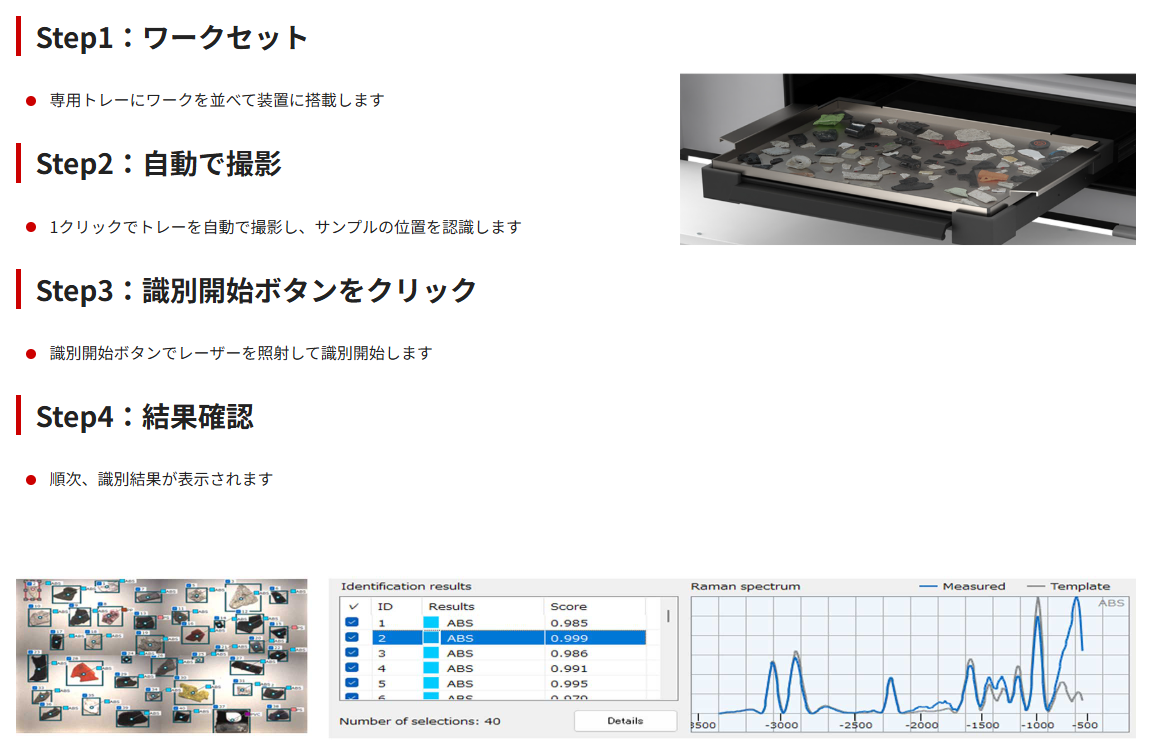 トレイ上に並べた複数のプラスチック片にレーザーを順次照射し、その際に発生する材質特有のラマン散乱光を分光解析することで材質を判別します。
